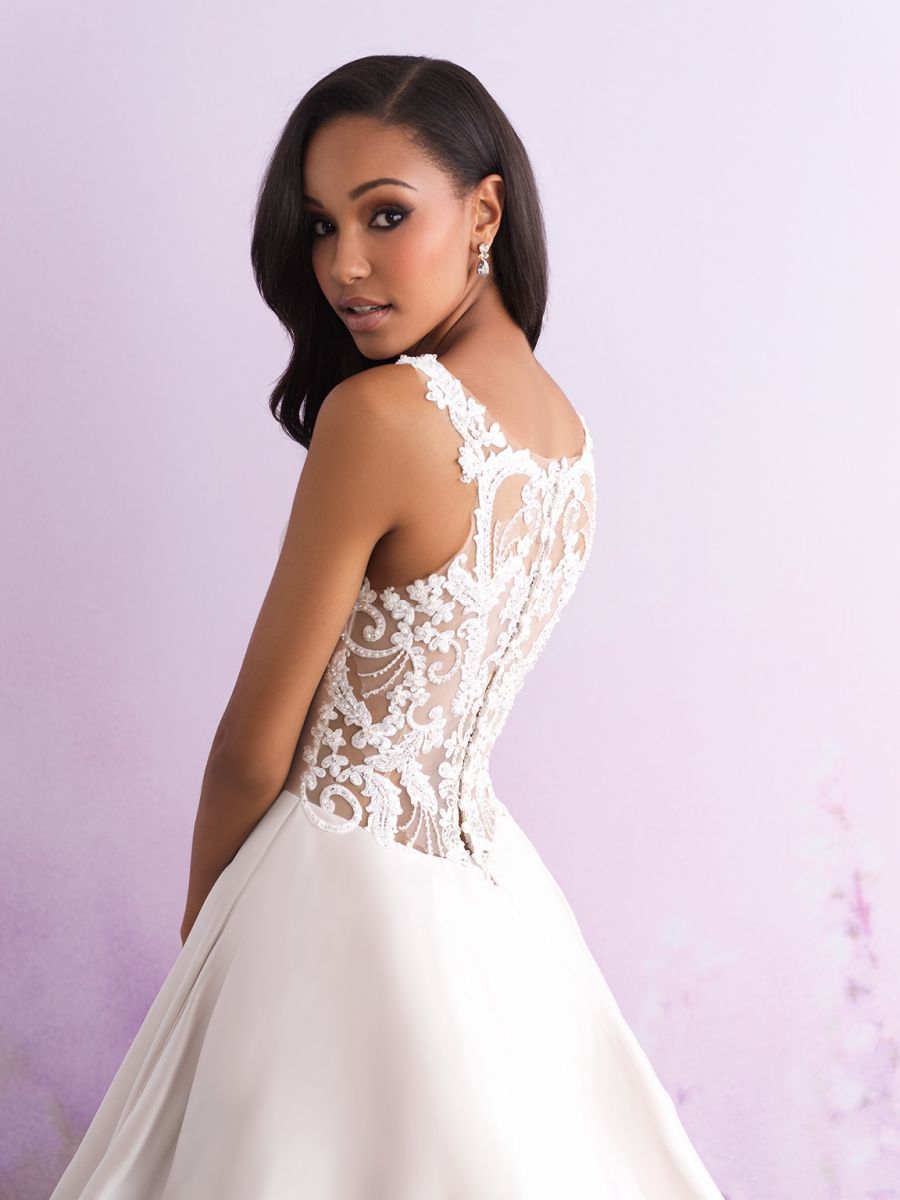 Elevate your bridal vision with this stunning satin ballgown that commands attention from every angle. Delicate straps provide graceful support while the daring plunging neckline creates an unforgettable focal point. The true showstopper? An exquisite illusion back adorned with intricate lace appliques that reveals just enough to captivate. This gown masterfully balances sophistication with drama, offering the timeless romance of a full skirt with contemporary allure. Perfect for the bride who refuses to compromise on elegance or impact.