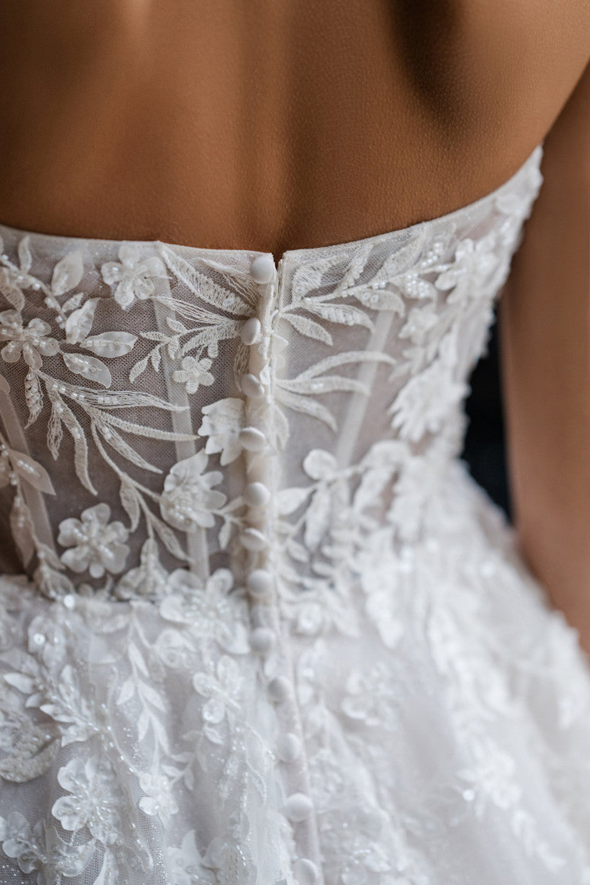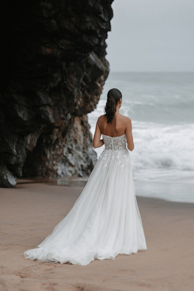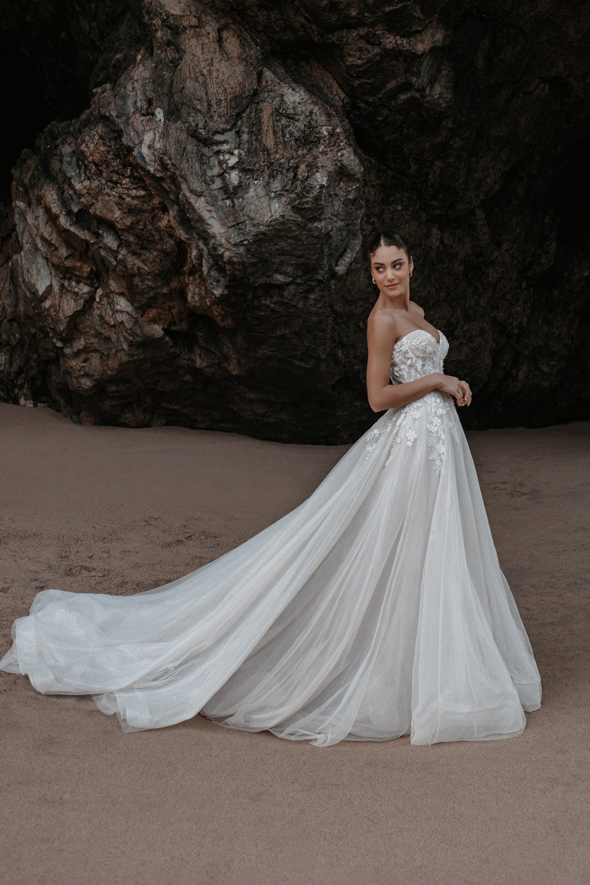 Benedita E461 combines elegance and charm in a stunning silhouette. The strapless sweetheart bodice, adorned with delicate beaded lace appliques, adds a touch of refined glamour, while the sparkling A-line tulle skirt flows gracefully for a flattering fit. Perfect for making a memorable entrance, this dress effortlessly blends romantic detail with timeless style.