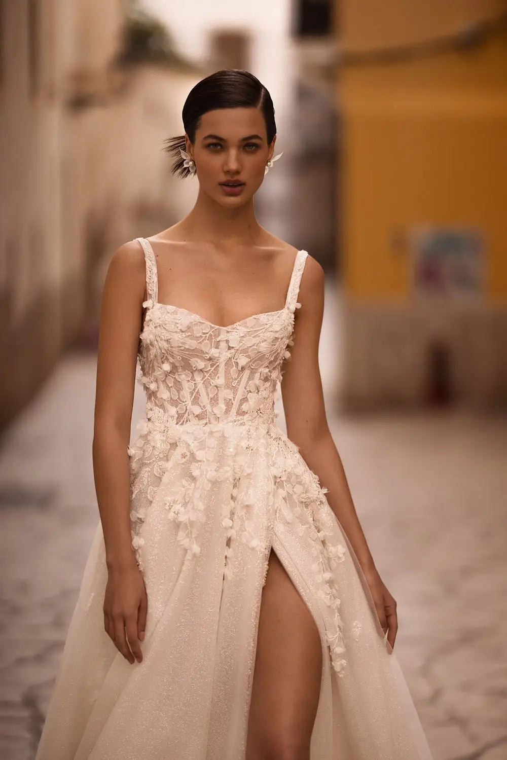 Experience the enchanting elegance of the Hazel wedding dress. Its shimmering fabric catches the light with every step, creating a radiant glow that draws attention. The intricately detailed floral lace corset seamlessly blends into the bodice and skirt, while supportive straps add comfort and style. Featuring a romantic sweetheart neckline and a flattering A-line silhouette, this gown gracefully flows to the floor, making you feel effortlessly beautiful on your special day.