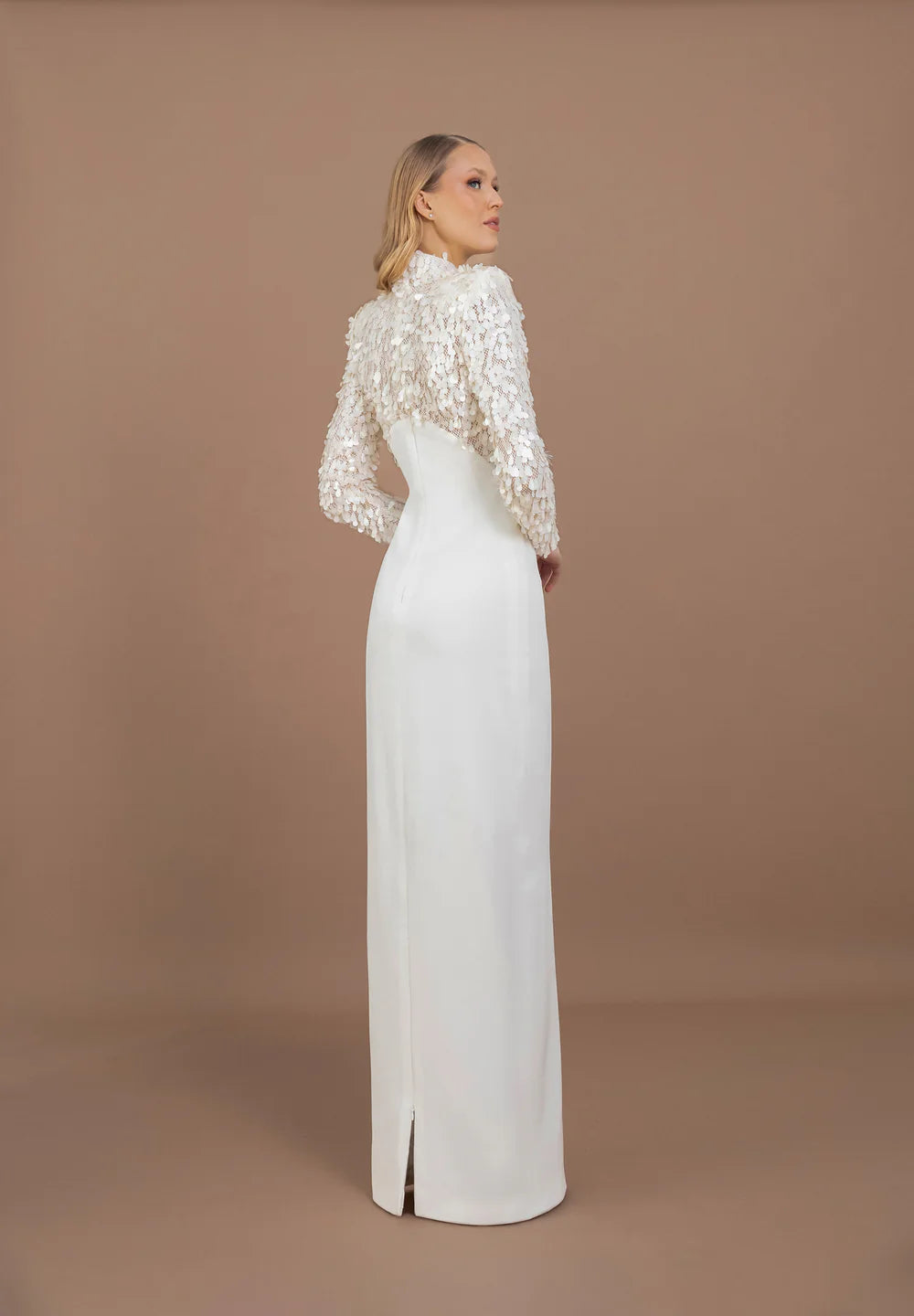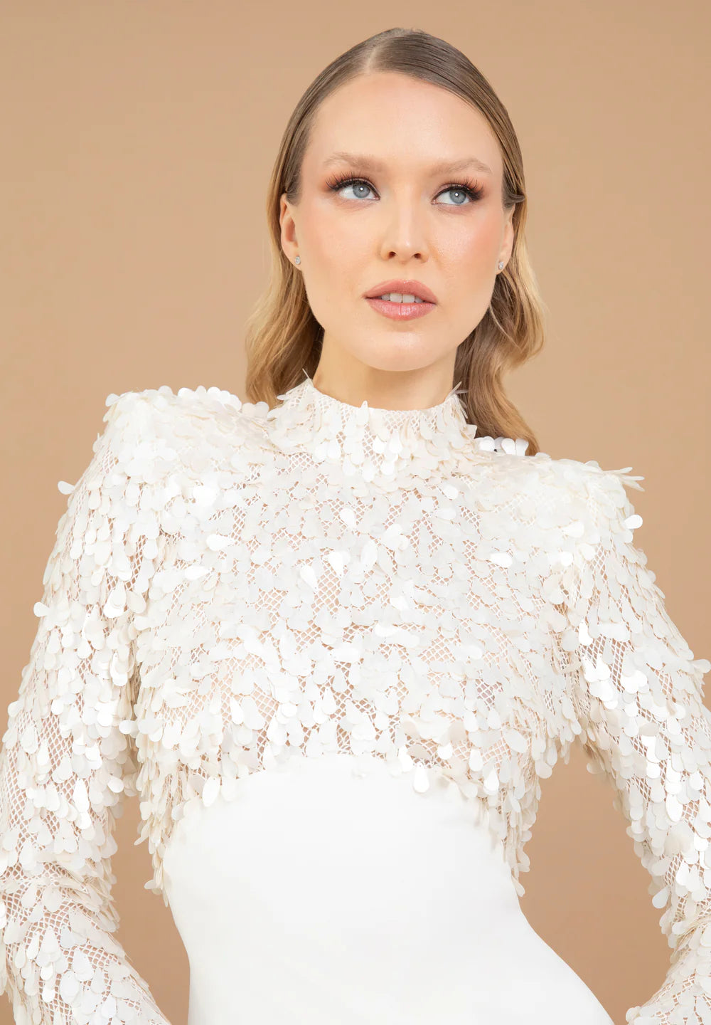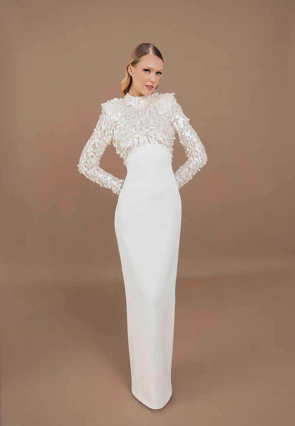 Make a statement on your wedding day in this stunning Larimar gown. Featuring a dramatic high neckline and structured shoulder pads that command attention, this dress exudes modern elegance with timeless sophistication. Intricate teardrop sequins cascade across the entire bodice, catching light with every movement for an unforgettable shimmer. Long sleeves provide graceful coverage while the fitted skirt skims your silhouette beautifully, creating a sleek, flattering line. Without a train, you'll move freely and confidently throughout your celebration. This is the dress for the bride who dares to be bold.