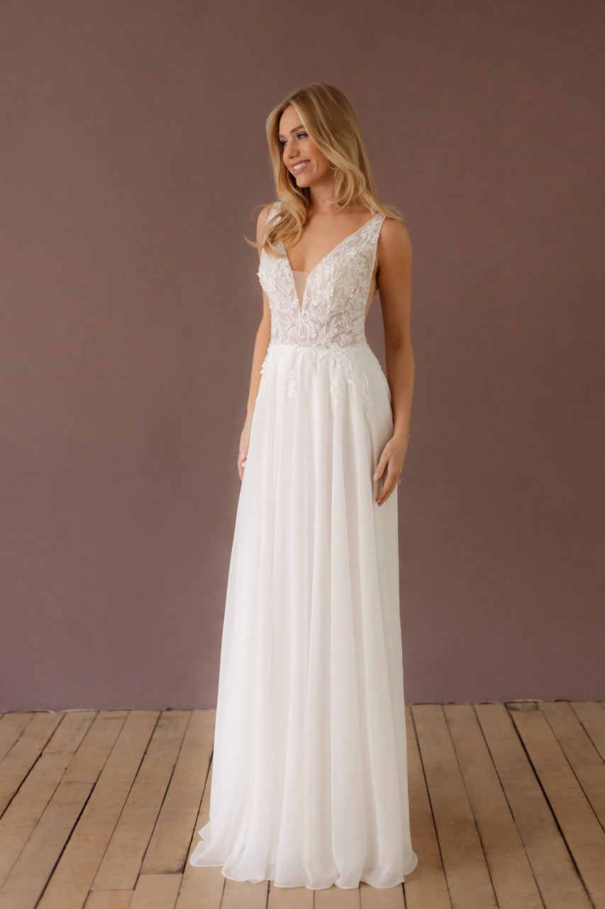 Discover elegance with the Sana - X164 wedding dress, featuring a delicate lace top that gracefully trails onto a flowing chiffon skirt. Its soft A-line silhouette and flattering V-neck create a timeless look that enhances your natural beauty, perfect for your special day.