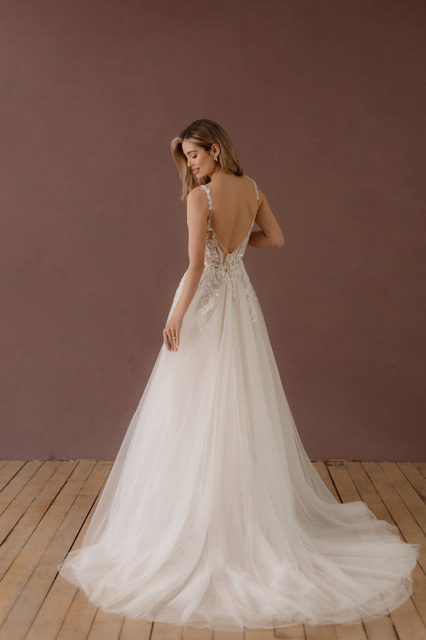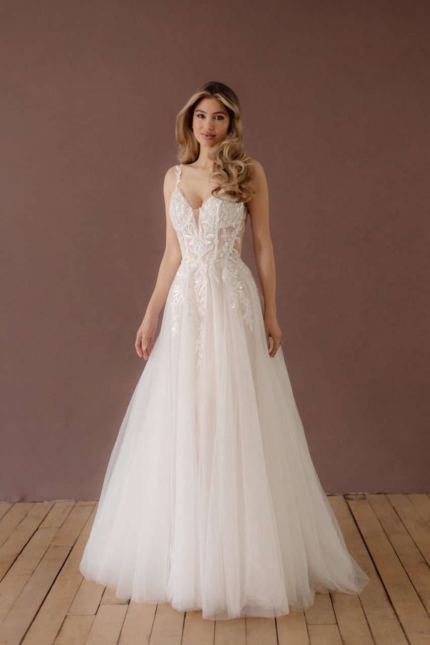 Elevate your bridal look with the Selene-X154, a stunning wedding dress designed to captivate. Featuring a daring low back and delicate spaghetti straps, this gown combines exposed boning with intricate lace and shimmering sequins for a modern yet romantic feel. The plunge neckline enhances elegance, while the voluminous tulle skirt adds a dreamy, ethereal touch. Perfect for brides seeking a blend of sophistication and glamour on their special day.