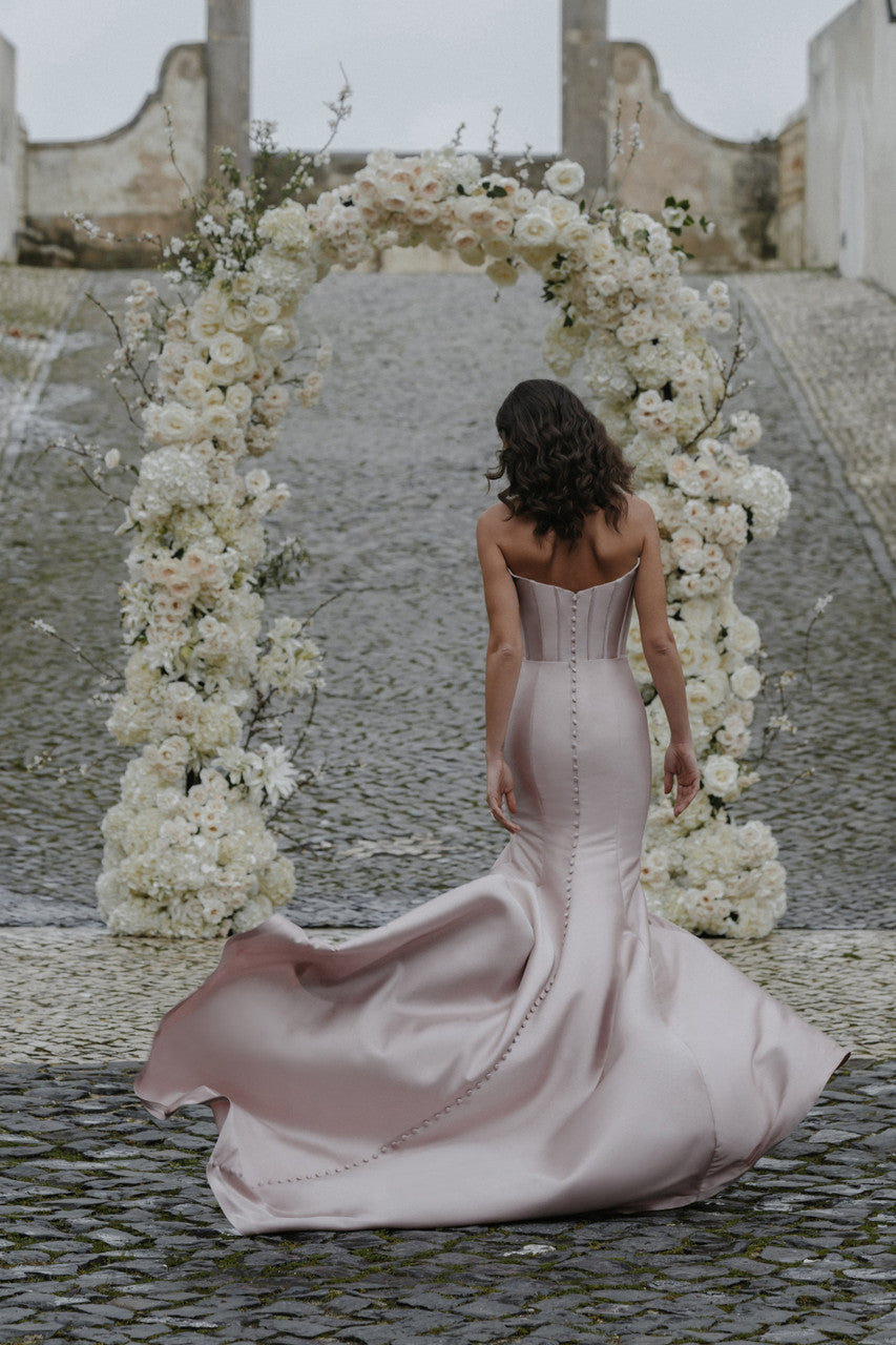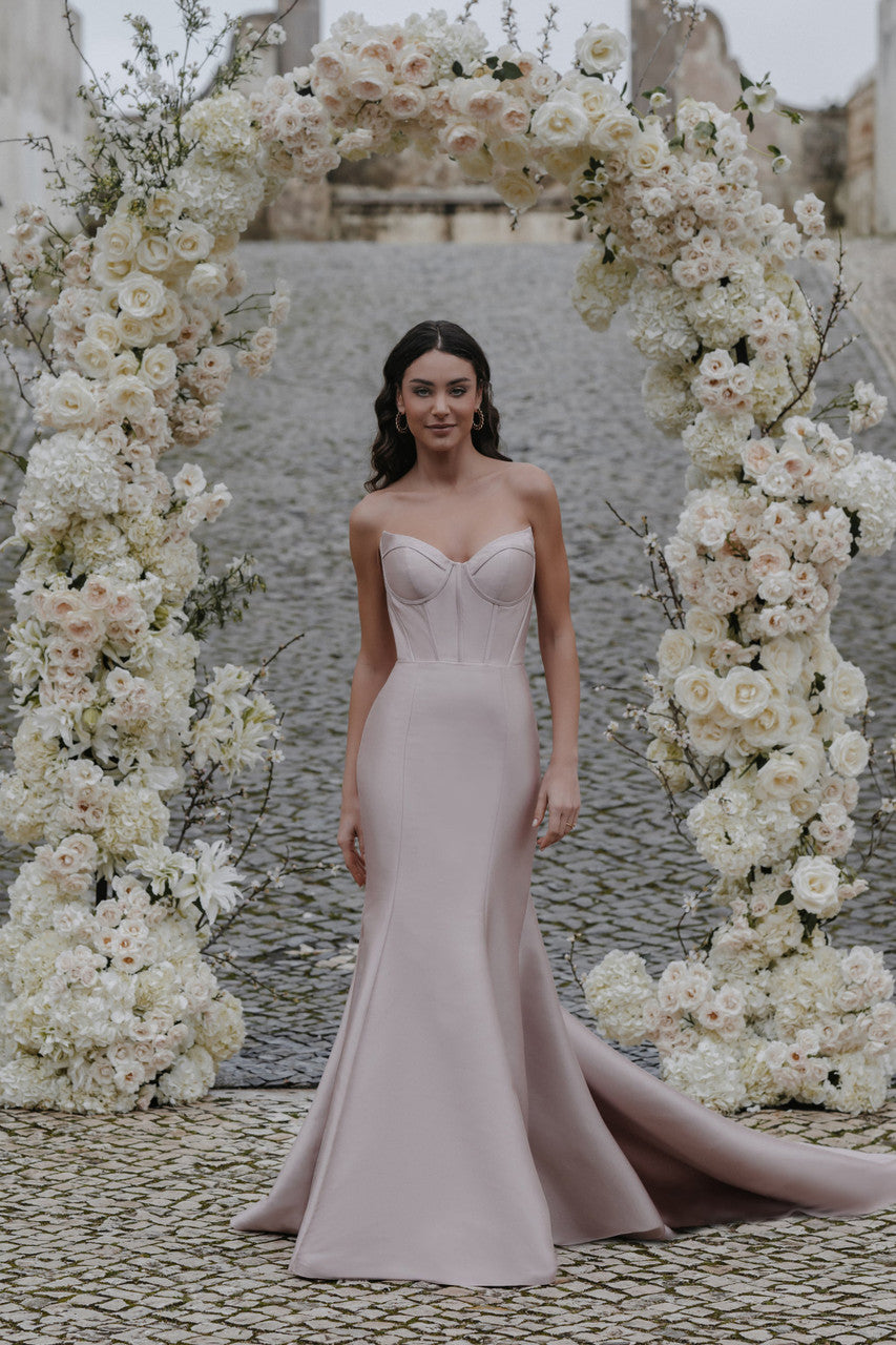 The Sofia E452 wedding gown captivates with its elegant simplicity and refined style. Its chic cateye neckline beautifully highlights the luxurious sheen of the Mikado fabric, perfectly complementing the fitted bodice and gracefully flared skirt. This silhouette enhances your natural curves while offering timeless sophistication, making it the ideal choice for a bride seeking understated yet striking elegance on her special day.