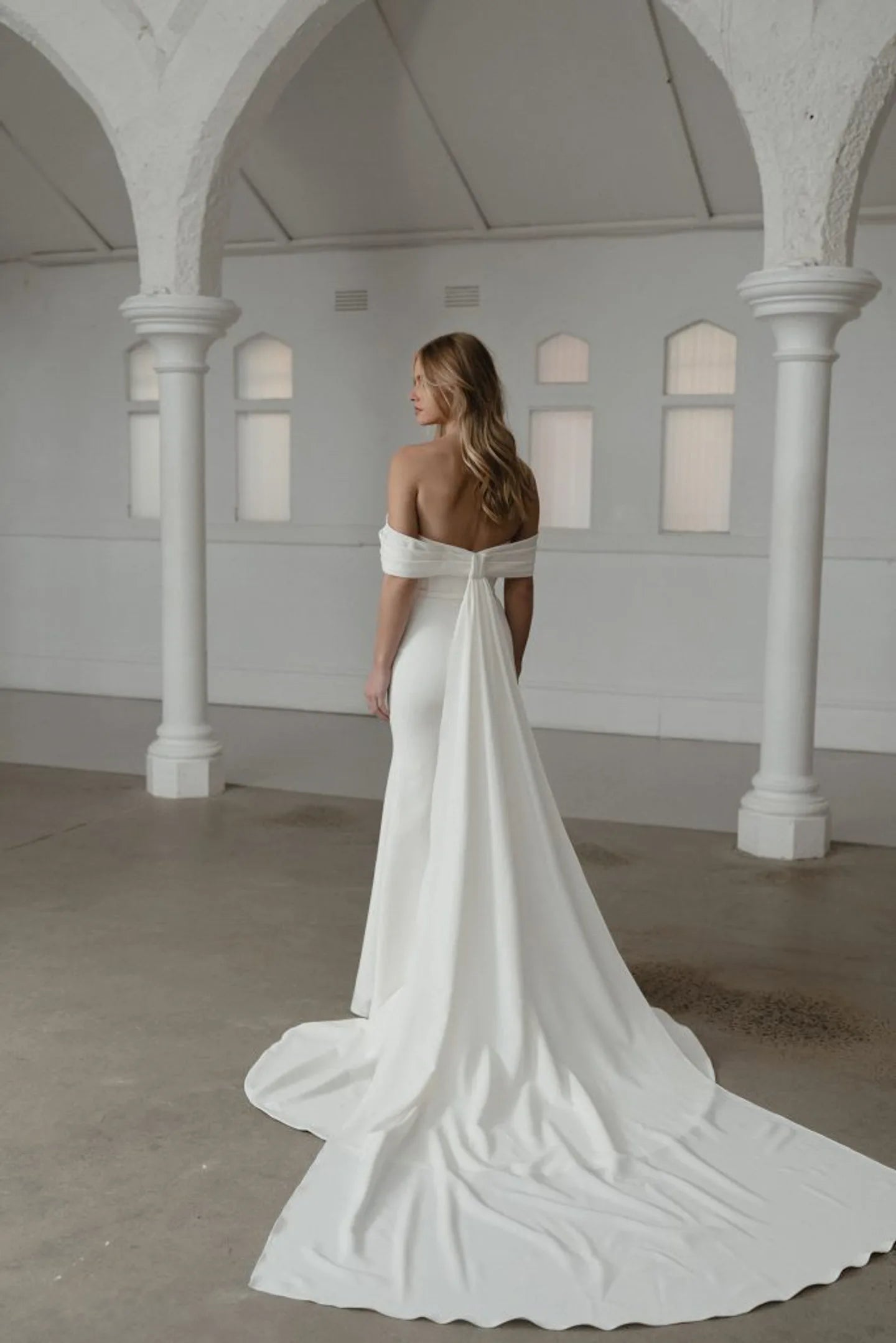 Crafted in the super soft and stretch crepe with the strapless bow detail on the exposed boned bodice. She boasts a striking fit and flare silhouette which emphasizes the brides silhouette to perfection.