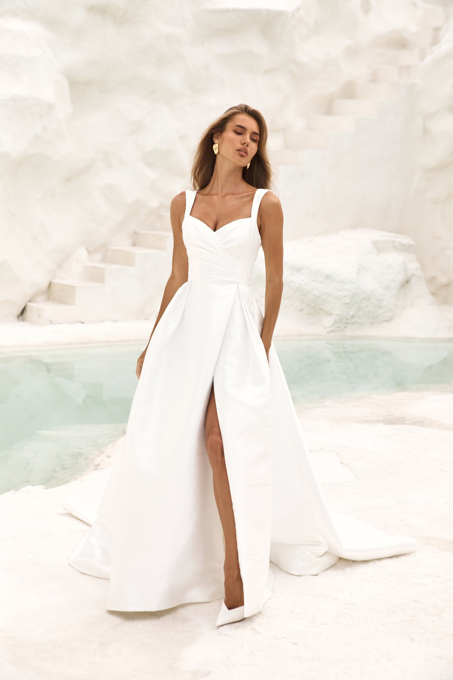 The Spencer gown delivers timeless elegance for the bride who values classic style. Its wide tapered straps offer comfortable support, while the crossover pleated detailing on the bodice brings subtle sophistication. Perfectly balanced design ensures you feel confident and graceful on your special day.